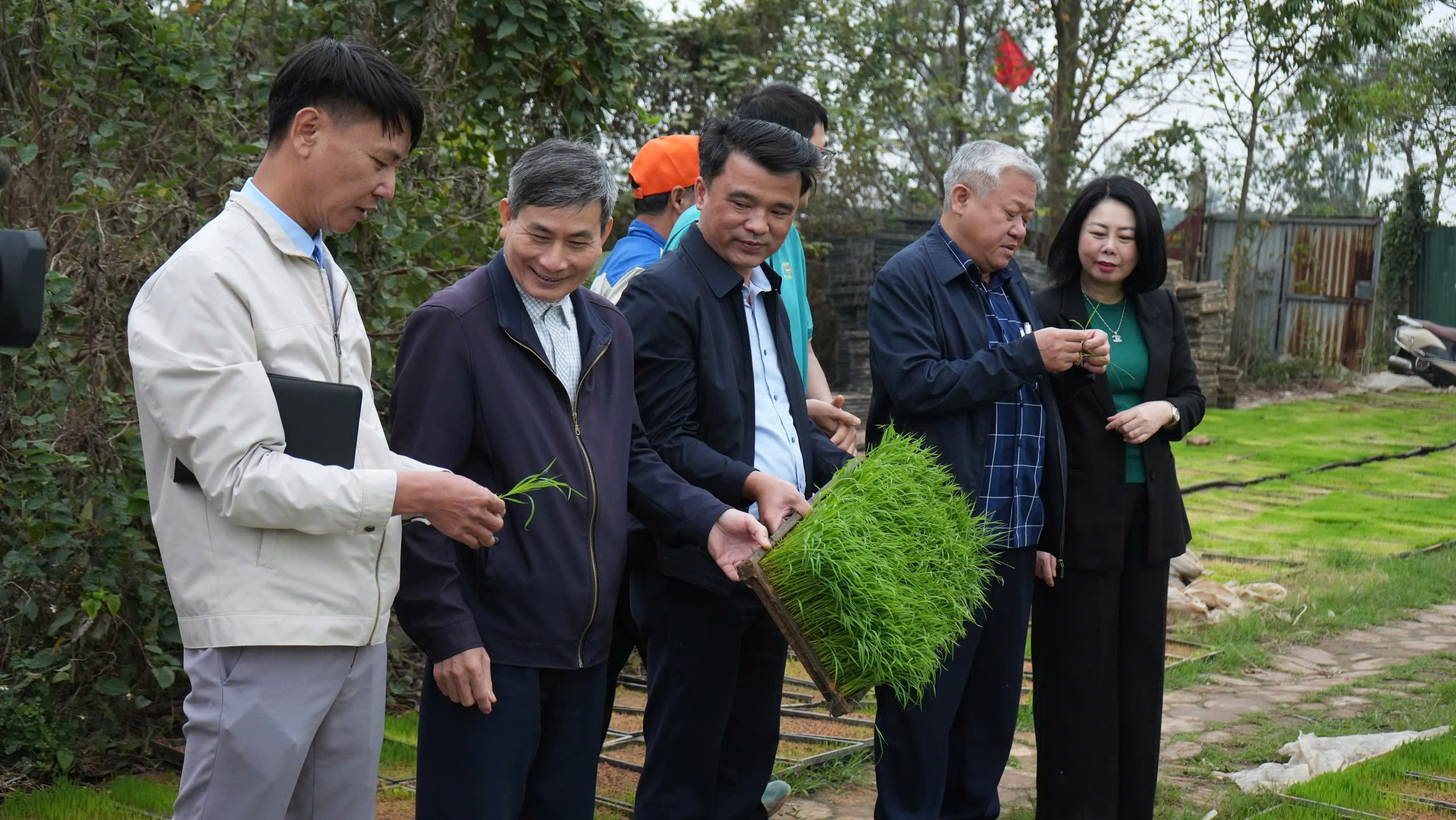 Lãnh đạo Sở Nông nghiệp và Môi trường Hà Nội kiểm tra khu sản xuất mạ khay của Hợp tác xã Liên Hà