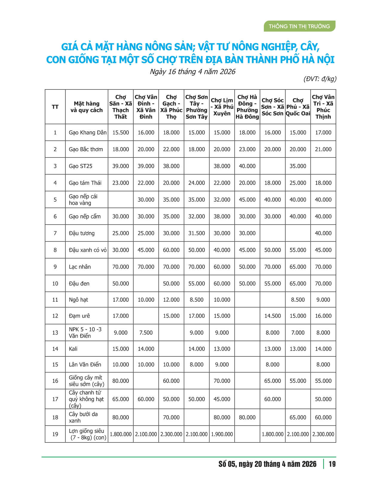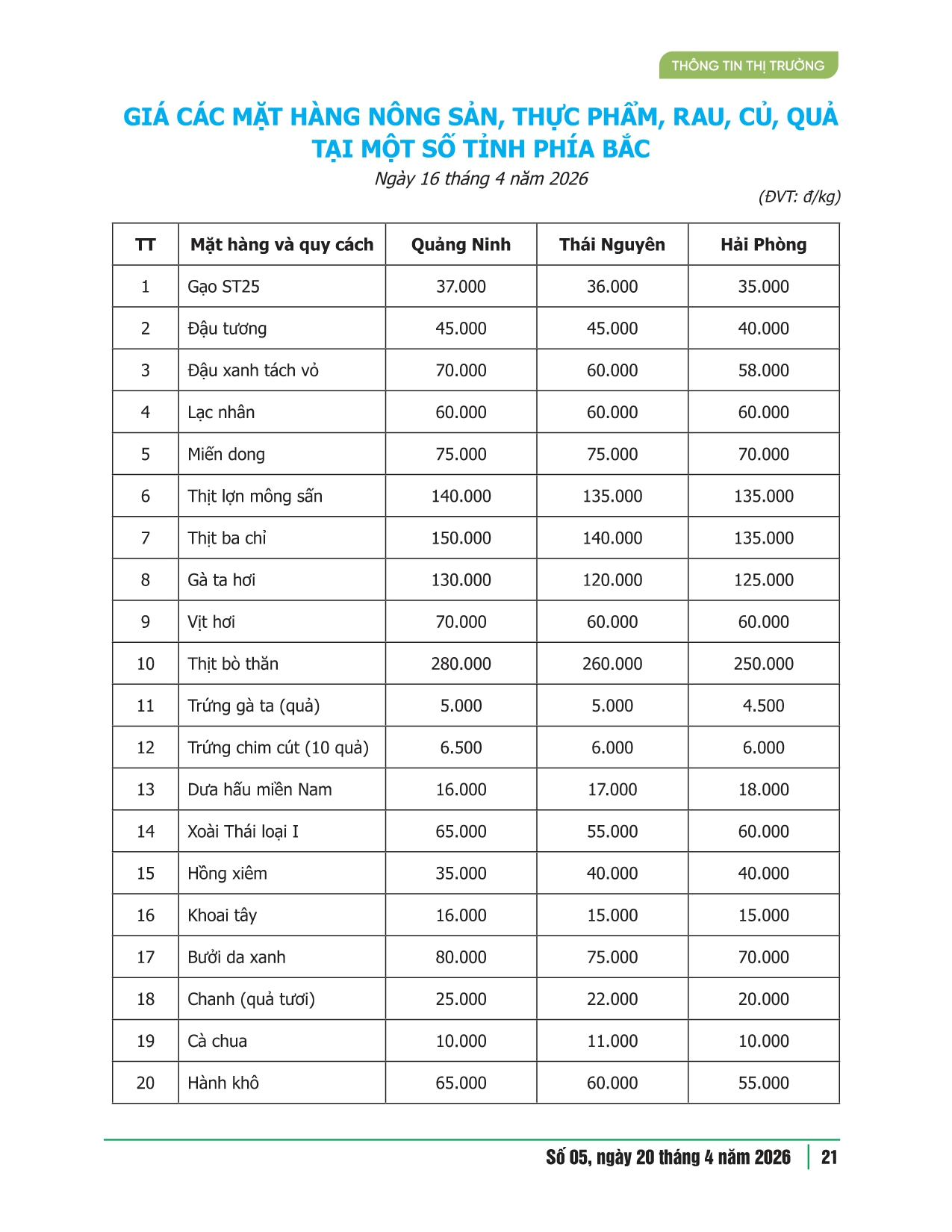 Giá các mặt hàng nông sản tại một số chợ trên địa bàn thành phố Hà Nội và một số tỉnh phía Bắc số 05 năm 2026